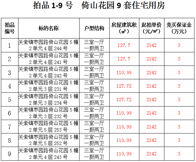 倚山花園9套住宅房產(chǎn),建筑面積:110.99—127.72㎡,起拍價(jià):2142元/㎡。