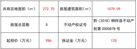 1、標(biāo)的位于遵義市桐梓縣婁山關(guān)鎮(zhèn)古夜郎街,該區(qū)域內(nèi)商業(yè)氛圍較好,人流量較大。房屋總樓層數(shù)為5層,房屋結(jié)構(gòu)為混合結(jié)構(gòu),西面臨夜郎街,北面臨巷道,其余兩面均臨多層建筑樓棟,共有宗地面積為272.70㎡,房屋建筑面積共計(jì)1079.09㎡。