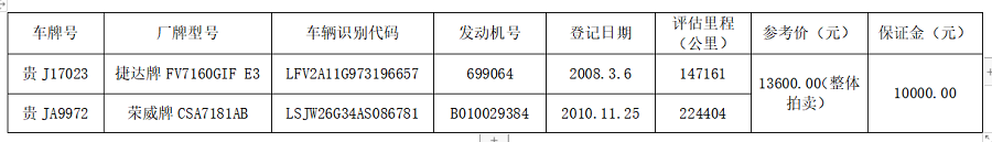 一、拍賣標(biāo)的:貴J17023、貴JA9972機(jī)動車各一輛。