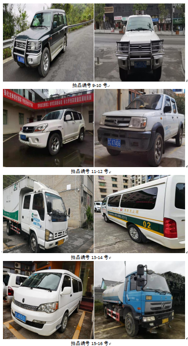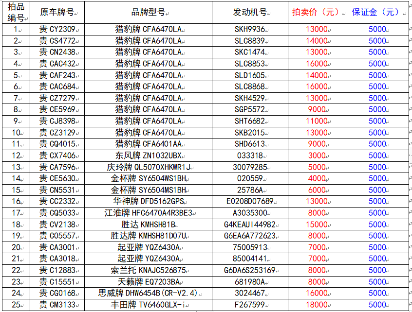 獵豹牌11輛、東風(fēng)牌車輛1輛、慶玲牌1輛、金杯牌2輛、華神牌1輛、江淮牌1輛、勝達(dá)牌2輛、起亞牌2輛、索蘭托1輛、天籟牌1輛、思威牌1輛、豐田牌1輛,共計(jì)25輛。展樣、報(bào)名時(shí)間(保證金):2021年11月4日至2021年11月10日(上午9:00至下午17:00,以保證金到賬時(shí)間為準(zhǔn)。)